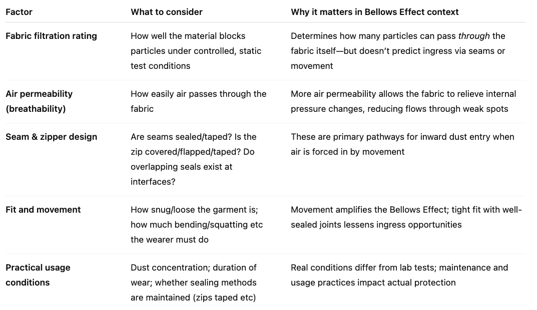 The Bellows Effect shows that air movement induced by your own body’s movement can be as significant a pathway for dust ingress as microscopic defects in fabric. In other words, even when the fabric is “perfect”, the garment is susceptible if it does not manage airflow holistically—through material choice, seam/zip design, and sealing.