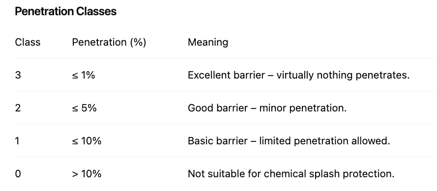 - Together, they determine whether a garment can be trusted for limited chemical splash scenarios.