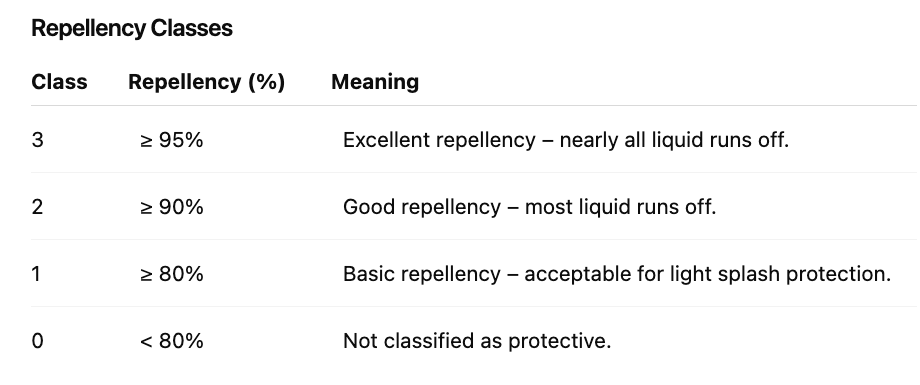 - Repellency Class 3 (≥95%) → almost all of the liquid runs off.